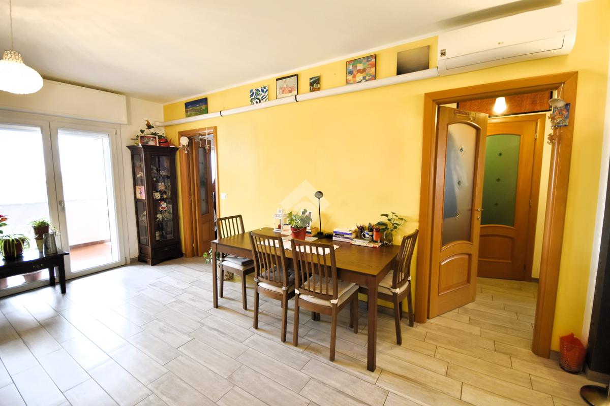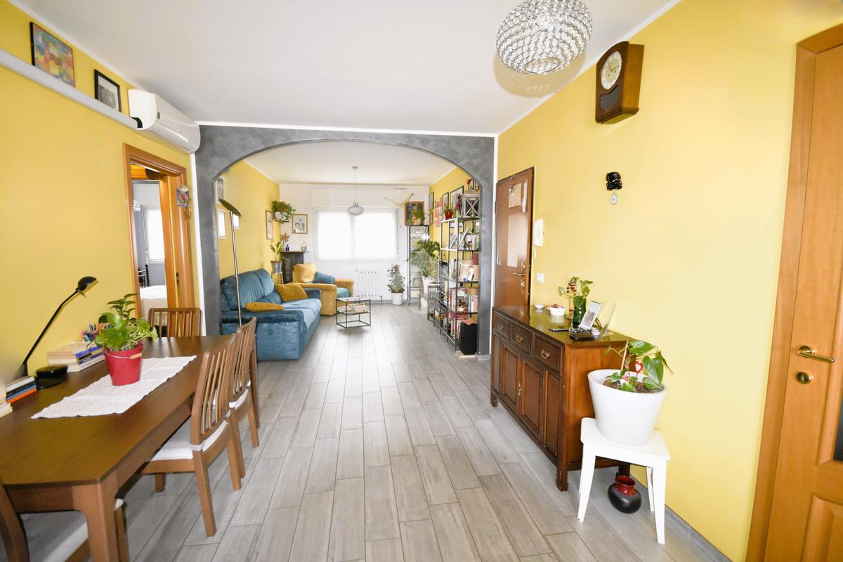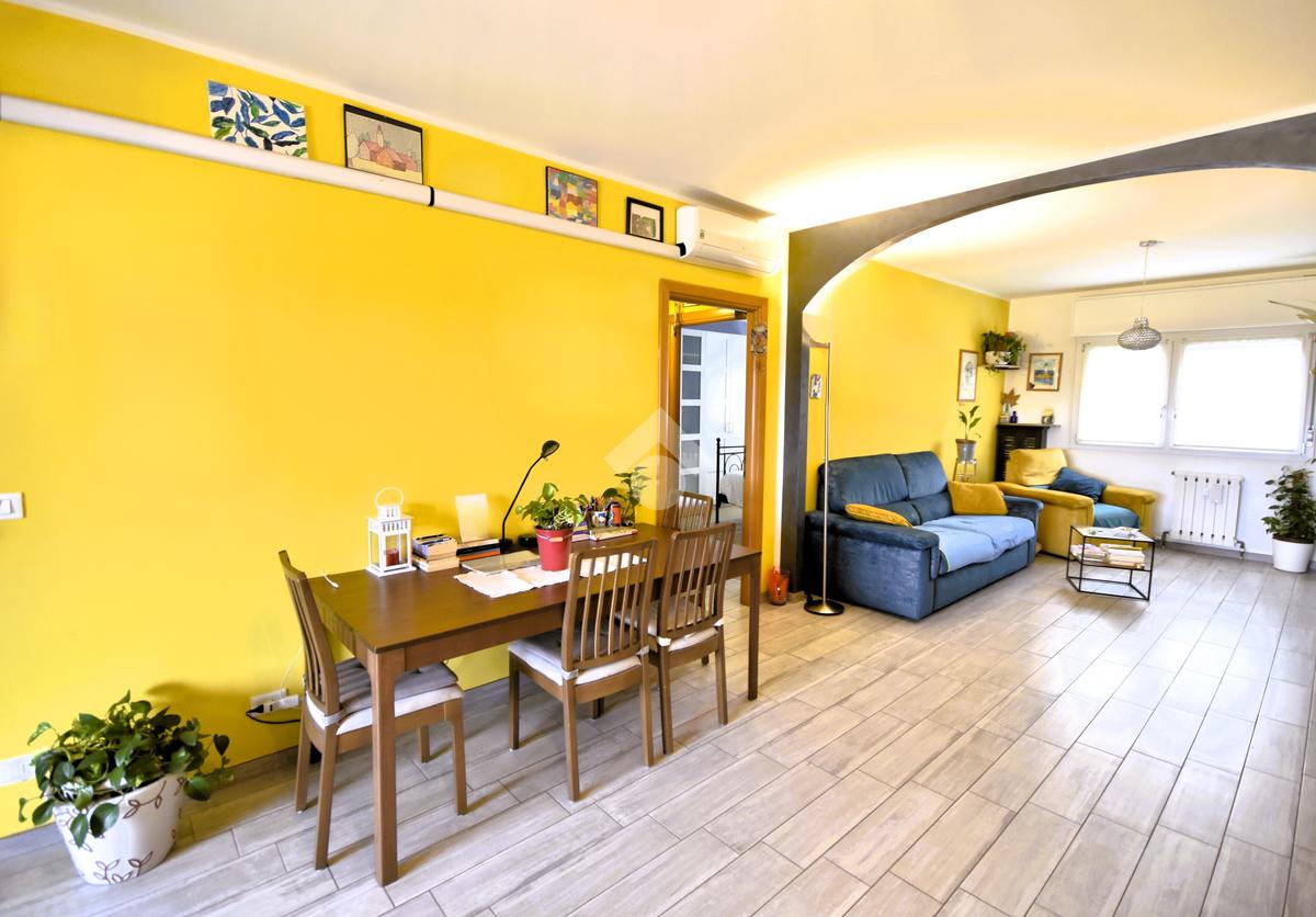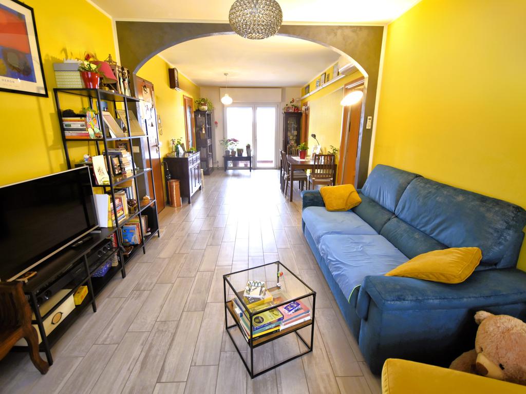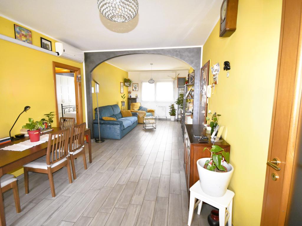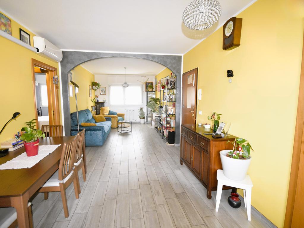 In zona semi-centrale del paese, nelle vicinanze delle scuole e dei servizi primari, proponiamo un appartamento di 85 mq situato al piano terzo con ascensore (piano nobile) dello stabile. L'immobile, ristrutturato nel 2020 in tutte le sue parti, offre ambienti accoglienti e funzionali; è composto da quattro locali: un' ingresso living attraverso un portoncino blindato sull'ampia sala doppia di circa 40 mq, con la possibilità di ripristinare la seconda camera da letto a seconda delle proprie esigenze familiari. Attraverso una comoda porta con apertura a libro, si accede alla cucina abitabile, dalla forma quadrata, consentendo l'utilizzo della mobilia su tre lati della stanza. La presenza di un terrazzo aggiunge un tocco di spazio esterno, ideale per momenti di relax; si accede dalla sala, arricchito di tende da sole estive/invernali, con vano caldaia per la produzione dell'acqua calda igienico/sanitaria. Un disimpegno separa la zona giorno con la zona notte, dove troviamo una camera matrimoniale confortevole, con presenza di ampia finestra, un bagno finestrato con doccia, due comodissimi ripostigli, di cui uno adibito a lavanderia con appositi attacchi idraulici; il secondo ripostiglio è posizionato subito all'ingresso, presente nella sala. La soluzione presenta una pavimentazione e rivestimenti in grès porcellanato nella sua totalità, ad eccezione del parquet nella stanza matrimoniale; impianti elettrico e idraulico rivisti totalmente; serramenti in PVC con vetro camera e aperture a vasistas; porte interne in legno con vetro satinato e zanzariere sulle aperture. L'appartamento è dotato di un sistema di climatizzazione, con due climatizzatori LG inverter, uno posizionato nella zona giorno (sala doppia) e l'altro nel disimpegno della zona notte, garantendo comfort in ogni stagione. Un ulteriore vantaggio è rappresentato dal pannello fotovoltaico personale, con batteria di accumulo da 10 KW, che si affianca ai pannelli fotovoltaici per le parti comuni, assicurando un'efficienza energetica ottimale. Nel 2022 il fabbricato ha subito l'intervento del Superbonus 110%, con il rifacimento facciata, con la realizzazione del cappotto termico, infissi totalmente sostituiti, tetto realizzato nella sua totalità, pannelli fotovoltaici per le parti comuni e a richiesta dei singoli condomini, l'installazione personale dei pannelli come per tale appartamento, con riduzione e netto ammortamento in bolletta. Completa la proprietà un posto auto riservato e di prorpietà. Le spese di gestione a carattere condominiale ammontano per Euro 40,00 circa mensili con acqua a parte a consumo; la quota fissa del riscaldamento del 30 % è pari ad 355,00 annui. Vista panoramica sul centro paese e colline. Possibilità di richiedere un mutuo Green data la sua classe energetica efficiente (A1).